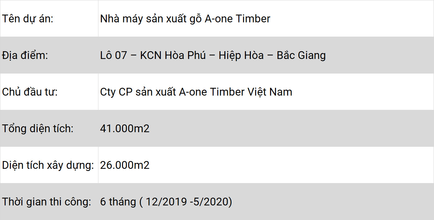 A-one Timber Đăng bởi vinacic vào lúc 05/10/2020 Bài viết liên quan XƯỞNG MAY TNG- VIỆT ĐỨC- THÁI NGUYÊN XƯỞNG MAY TNG SƠN CẨM- VIỆT THÁI XÂY DỰNG HẠ TẦNG CỤM CÔNG NGHIỆP SƠN CẨM 1 CÔNG TRÌNH Thiết kế và thi công nhà máy xử lý nước thải tập trung giai đoạn 3 - VSIP Bắc Ninh Mở rộng nhà máy may TNG Sông Công