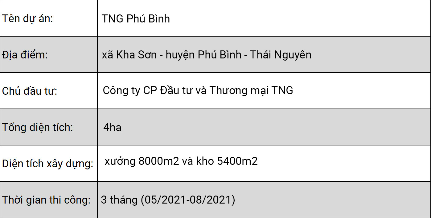TNG Phú Bình Đăng bởi vinacic vào lúc 20/04/2022 Bài viết liên quan XƯỞNG MAY TNG- VIỆT ĐỨC- THÁI NGUYÊN XƯỞNG MAY TNG SƠN CẨM- VIỆT THÁI XÂY DỰNG HẠ TẦNG CỤM CÔNG NGHIỆP SƠN CẨM 1 CÔNG TRÌNH Thiết kế và thi công nhà máy xử lý nước thải tập trung giai đoạn 3 - VSIP Bắc Ninh Mở rộng nhà máy may TNG Sông Công
